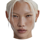 Even though her skin is pigmentless and translucent, she is visibly not caucasian. Her facial features are mixed but vaguely asian.